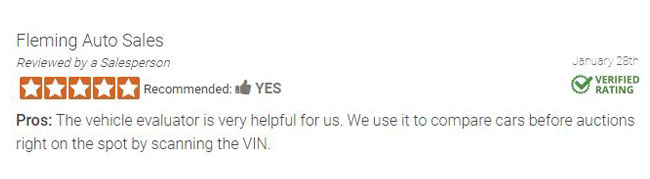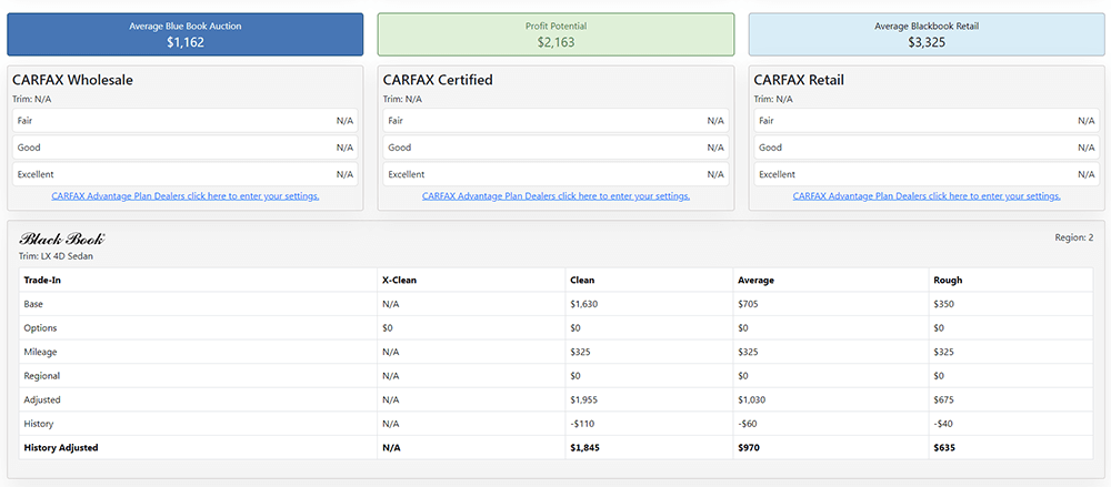 This tool will prove to be instantly valuable to your dealership by giving you Blackbook, Kelley Blue Book, and Carfax values in one place. Even scan the VIN from our DCS mobile app to see these same values on the go--especially at auctions.