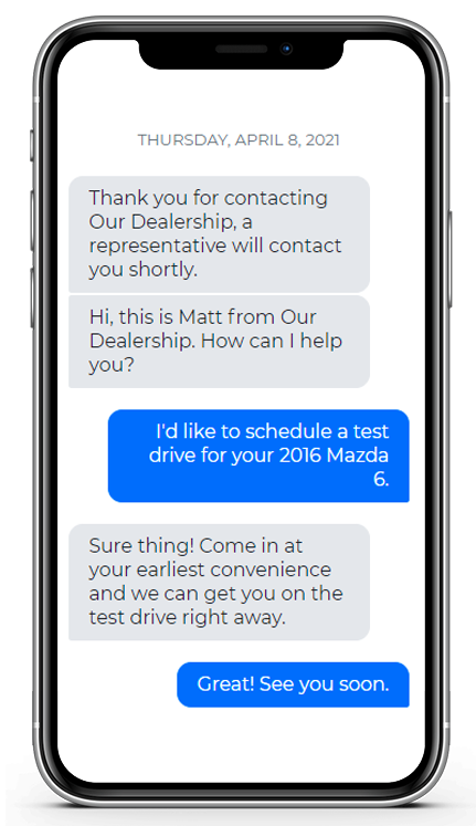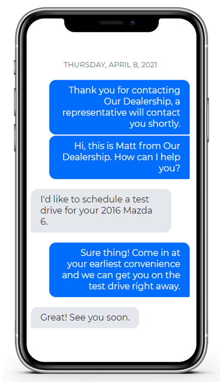 95% of text messages are opened and responded to within 3 minutes of being delivered. Generate more leads and appointments via website texting. Your customers are using one of the most responsive methods of communication possible to buy cars. Your Dealership should too!